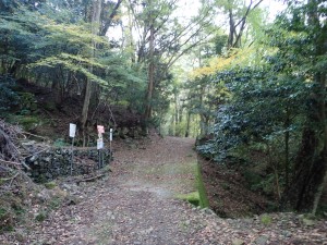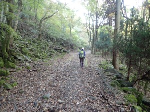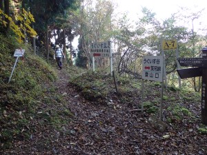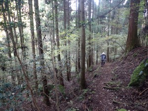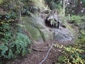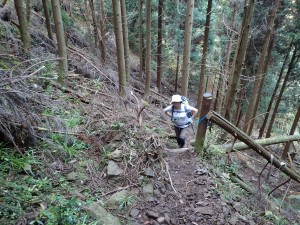 | 登山道は杉林の中を進む | 石の多い場所から急登し始める | かなり急だ |