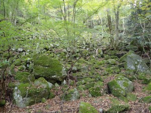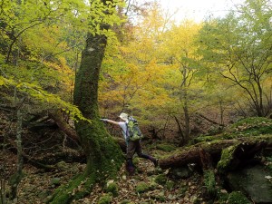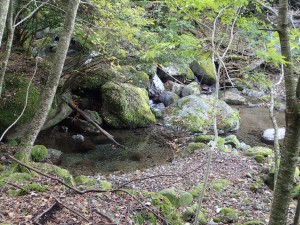 | 斜面は紅葉している | 沢沿いの林道歩き | 苔の付いた石がゴロゴロとある |