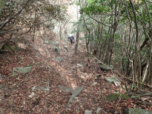 | 登山道は沢から上に離れてゆく | 紅葉は続く | 板状の岩 |