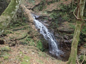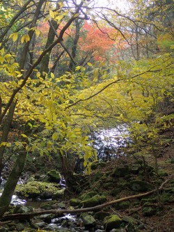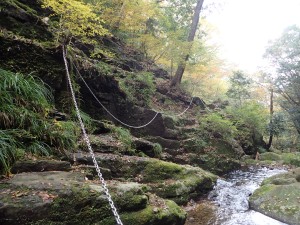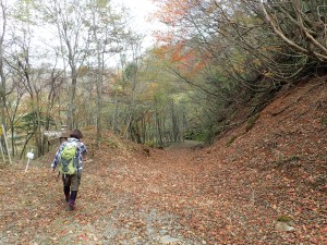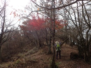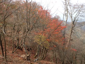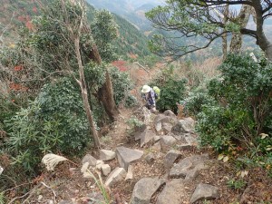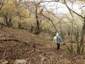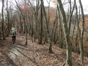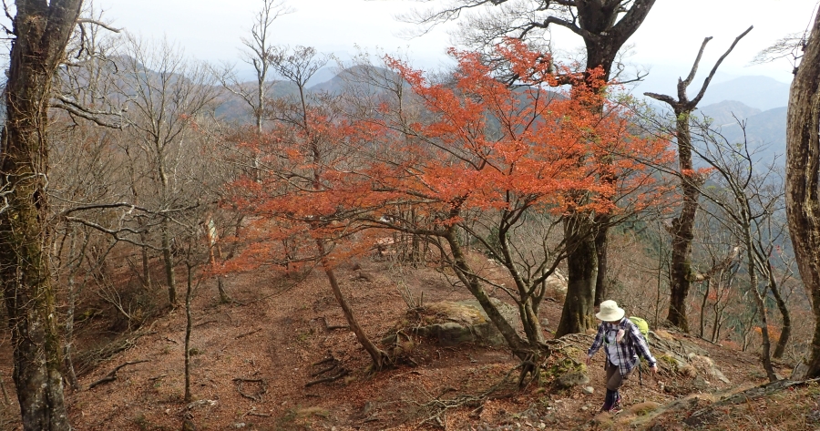 | 前ページより 笈吊峠から結局周回コースを辿って稜線にとりつく。紅葉に声をかけながらシャクナゲのトンネルを歩く。花芽は少ない。 山頂に着くと笈吊岩でモタモタしている間に追い越して行った子供連れのグループがランチを楽しんでいた。とても楽しそうだ。ベンチを譲ってくれたので私たちもここでランチタイムとし、珈琲を淹れのんびりと過ごす。 下山は、恐渕コースだが、まずは大竿峠までブナやミズナラの美しい稜線を歩く。 紅葉している樹はチラホラだが、それでも落葉樹が多いので目立つ。もちろん登山道は落ち葉でフカフカ。とても気持ちの良い稜線歩きだ。 大竿峠で先に山頂を出発したファミリーグループを追い越して谷間へと降る。 林道に一旦出て紅葉を満喫して杉林の登山道へと入る。涸れ沢はいつの間にか水量が増えてゆく。最初の鎖場からヘルメットを着用し、滑落しないよう慎重に降ってゆく。 沢に近づいて行くとりっぱな滝があって「鈴の中尾」と書かれた説明板が設置されている。 沢沿いにアップダウンを繰り返し、このコース一番の難所である渡渉点を鎖を頼りにクリアする。とにかく滑りやすいので注意だ。木橋を渡ると今度は恐渕の説明板がある。 登山道は沢の岩壁沿いに伸びて行くが、それが終わると沢から離れ、杉林の作業道沿いの道になる。杉の伐採中のようで登山道は以前と様子が変わっている。 最後の渡渉点も以前とはまるで違って単に道路の切れ間となっていた。 コンクリートの林道になるとゴールは近い。下山口(登山口)は、ヤマメ料理の(数年前に茶房○○○○と看板があった)二件のお店の間に出る。 橋を渡って駐車場に無事到着。先を歩いていた方と少し話をして帰宅した。今日、犬ケ岳を歩くことにしたのは私と同じ考えだった。 今日も山に自然に地元の人に感謝!! ■コースタイム 犬ケ岳公共P-(75分)-経読林道-(25分)-笈吊峠-(60分)-山頂-(25分)-大竿峠-(15分)-経読林道-(20分)-鈴の中尾説明板-(20分)-渡渉点-(13分)-恐渕説明板-(40分)-犬ケ岳公共駐車場※休憩時間含まず。全行程で約6.5時間でした。距離9.58km、標高差718m |
