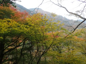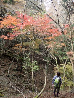 | 山の斜面も紅葉している | 慎重に | 岩壁沿いに歩く |