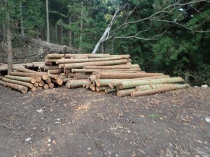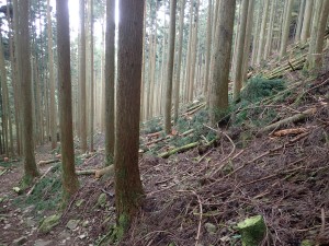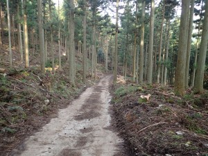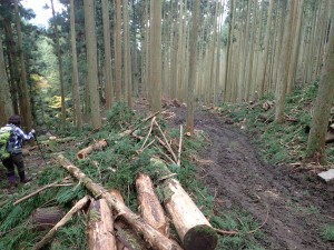 | ここから右に(14:59) | 杉林の植林帯に入る | 伐採中のようだ |