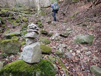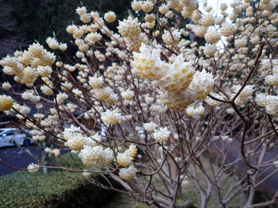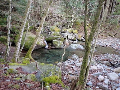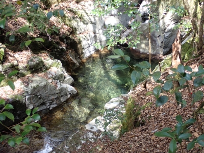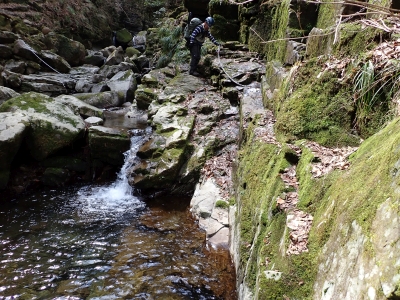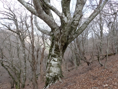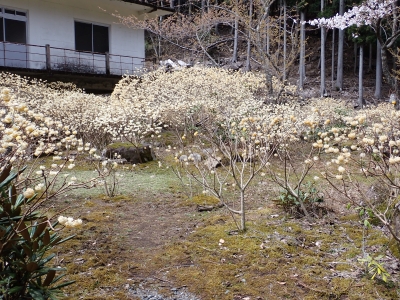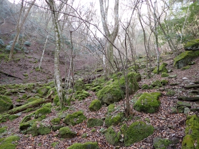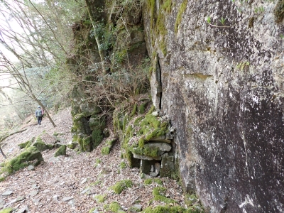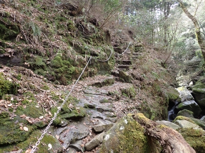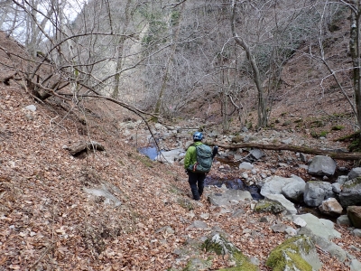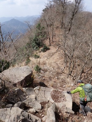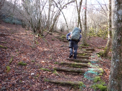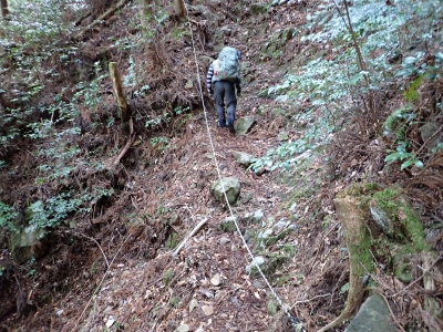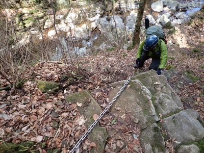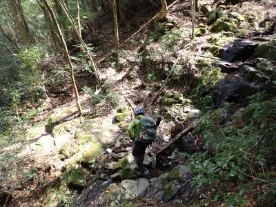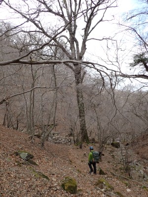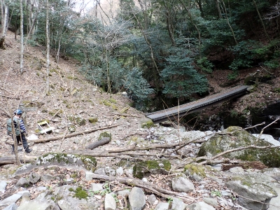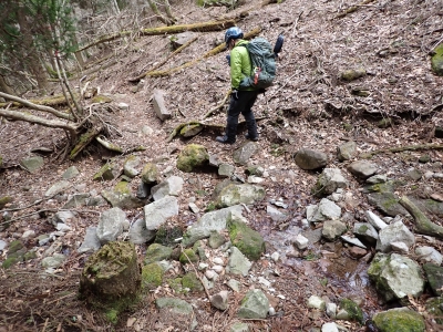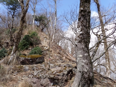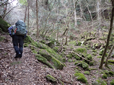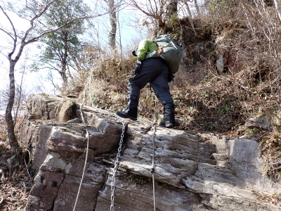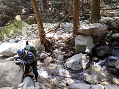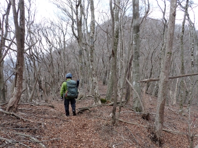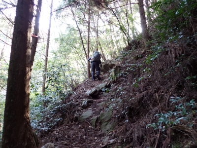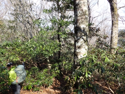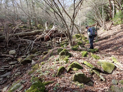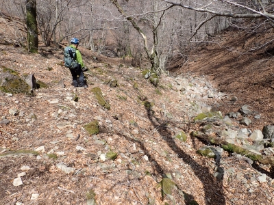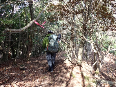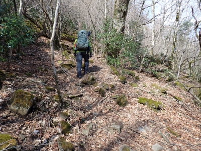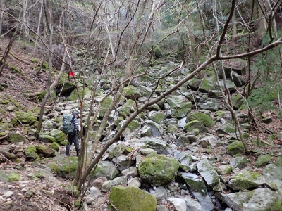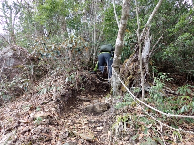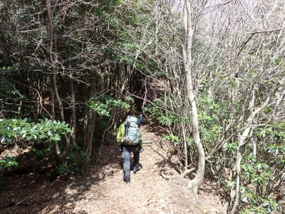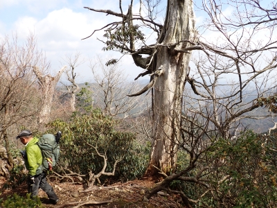 山の会の今月の例会山行は犬ケ岳のシャクナゲ鑑賞の予定である。過去の日記を確認すると4年前の9月にやはり山の会で歩いている。今回CLを担当してくれるMさんからの声かけで下見をすることになったが寂しいことに参加者は私だけとなった。ルートは、うぐいす谷から恐渕への周回が最もスタンダードだろう。北九州近郊の山としては結構ハードな方で岩場も多く危険な場所も多い。特に雨などで増水すると沢の渡渉が困難になる場所もある。高齢者が多い我がメンバーはヘルメットは必須で念のためセルフビレイ可能な装備を準備することにした。駐車場に着くとミツマタの花が迎えてくれた。見ごろは過ぎているようだが、賑やかな花にホッコリする。登山道を進むが何度も歩いた道なので記憶がしっかりとある。急登して林道に出て再び登山道への標識が見えるのだが、様子がまるで違う。大雨で土石流が発生したのか、石がたくさん流れ込んでいた。谷間を詰めて行くが、倒木が豪雨で押し流されて道が寸断されているところもある。笈吊峠に着くと岩は登らず迂回路を進むが、迂回路からは笈吊岩へは立入禁止の表示があって注意が促されていた。腕力のみで登れる自信が無い限り、とても難しい岩場なので(2001年に登ったときは足がかり手がかりがあってそう難しくなかった記憶がある)無理せず、迂回路を行くべきだ。できれば「迂回路」と言う言い方を止めて「本道」にした方が良いと思う。稜線に取付くとシャクナゲの群落が続くが、残念ながら花芽が少ない。本番では、どうメンバーに言い逃れをするか考えておかなければ・・・。さて結構長い稜線歩きは多少の鎖場などもあり、意外とハードである。山頂に着くと未だ10時半なのでランチには少し早い。もう少し先まで進もうと未だ冬枯れのきれいな樹林帯の稜線をのんびりと歩く。大竿峠の手前にピークでランチタイムを過ごし、峠から恐渕へと降り始める。うぐいす谷も同じだが林道に出る手前はこちらも岩がゴロゴロとして以前と違う景観になっていた。恐渕までは滑らないように慎重に歩く。大きな沢の渡の渉ケ所付近が一番の難所でとにかく滑りやすい。このところ雨が少ないので沢の水量が少なく、渡渉には問題なかった。恐渕からの道も途中で寸断された場所もあり、自然のすごさを改めて感じる。林道に出て舗装道に出る。以前はやまめ料理の店があったが、現在は営業していないようでひっそりとしている。ミツマタがたくさん植えてある場所は登山者の休憩場所として利用を許可していると表示があった。大きな桜の樹もあるので弁当広げるには良い場所かも知れない。今日も山に自然に山友に感謝!!