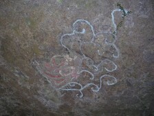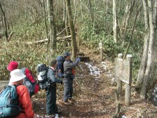 犬ヶ岳山頂にて集合写真を撮り、休憩をしたら大竿峠を目指し尾根歩きを進みます。アップダウンしますが、途中のピークがおそらく二の岳でしょうか(ガイドブックではそうなっているが)それとも犬ヶ岳が二の岳なのか、よくわかりませんが山頂から約20分ほどで大竿峠の到着です。一息ついて一の岳を目指します。木の階段を上り、左から右に巻くように稜線を歩き人上りすると一の岳山頂です。ベンチも2つあり広々として食事をするには最高の場所です。展望は西南側が素晴らしく英彦山方面が望めます。今日は陽射しが強く暑いくらいの陽気で食事をしました。食事を済ませ、集合写真を撮り、出発です。ここからは下り主体ですが、アップダウンを繰り返します。素晴らしいブナ林を歩き赤松の林を経て林道を2回横断し、、一の岳から約45分で杉の宿に着きます。杉の宿の案内板には「ここは広い台地になっており入峰のさいの秘密の行法を伝授したと言われている。また山伏の宿場にもなったところである。・・・・」と書かれています。休憩をしてさらに進むと新しい林道の工事が行われていました。なぜ必要なのかわかりませんが、山が傷つけられて痛々しく感じました。道はブナ等の落葉樹から杉や檜木の林となり、杉の宿から約30分で虎の宿に着きます。案内板には「この場所を虎の尾、また虎の宿と言って山伏の峰入の再の行場の一つであった。この下に岩窟がありその名を虎の窟という。ここには座主が発願造立した石仏が安置されている・・・・」とあります。虎の宿から急降下し、長い下りとなり、上り返すと虎の宿から約20分で胎蔵界護摩場跡に着きます。下山はここが分岐になります。ここより求菩提山の山頂を目指します。急登を約10分喘ぐと山頂です。集合写真を撮り下山です。護摩場跡まで戻り、五窟巡りをして求菩提資料館バス停駐車場に降ります。先週は樹氷やつららが見れましたが、このところ暖かいため全く見れませんでした。 <参考コースタイム> 犬ヶ岳登山口−(80分)−笈吊峠−(50分)−犬ヶ岳山頂−(20分)−大竿峠−(20分)−一の岳−(40分)−杉の宿−(30分)−虎の宿−(20分)−護摩場跡−(10分)−求菩提山頂−(60分)−求菩提資料館バス停 ※休憩は含んでいません。あくまでも参考時間です。全行程で約7.5時間でした。 <岩洞窟に立ち寄る> しんでんさんのお薦めで帰りに岩洞窟に寄る事にしました。そこには天井に描かれた壁画があります。「迦陵頻伽」と言う絵です。とてもめずらしいようで上半身が菩薩、下半身が鳥 でインドでは音楽の神とされ浄土では好声で鳴くとされているそうです。高さ約4mの岩天井に描かれていました。 |