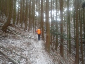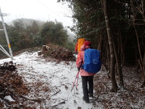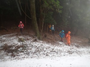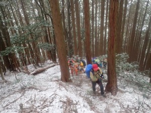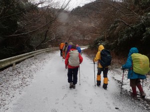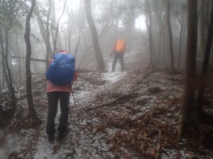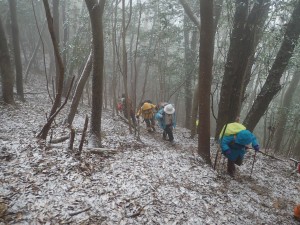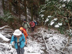 平30年1月28日(日)天気 曇り時々雪 ■出発時間:AM7時30分 北九州市小倉南区下曽根付近 ■メンバー:男性6名、女性6名 計12名 アタック山の会の新年登山は、今年の干支にちなんで「犬鳴山」。 犬鳴峠とか犬鳴トンネルと聞くと福岡の心霊スポットとして有名だが、歴史を辿るとかなり昔に熊ケ城と言う宗像氏の詰城があったらしい。また、犬鳴山の名の由来についても「犬啼怪奇」などの伝説もある。 このところの冷え込みで道路凍結で通行止めにならないか、心配していたが何とかギリギリの気温で無事「親水公園」に着いた。 先月(昨年12月)の下見では、西山を薦野峠から往復したが、体力的にも時間的にも本番では厳しいと判断した。しかも防衛省が「立入禁止」としているのも取りやめた理由でもある。 寒さは厳しいが、歩いていると汗も出てくる。薦野峠から犬鳴山頂上まではとにかく長い。アップダウンも数えるのが面倒になるくらい繰り返す。 番兵跡を過ぎるとガスが濃くなって途中開けた場所でも眺望は得られなかった。 ようやく犬鳴山の頂上に着くとメンバーの一人が「雪を踏まないで集合写真を撮ろう」と言うことになった。いかにも「積雪深し」と見えるからだ。 山頂からの下山で分かれ道に気づかず、少し降り過ぎてしまったが、すぐに引き返し、予定のルートへと取りつく。 急降下の登山道なので慎重にゆっくりと降る。最後の谷への降りは、ロープを架けて滑り落ちないようにした。おかげで無事下山。今日も自然に山に仲間に感謝!! ■コースタイム 親水公園-(67分)-薦野峠-(50分)-番兵跡-(13分)-椿峠-(55分)-猪野越-(50分)-犬鳴山-(80分)-ダム車道 ※休憩時間含まず。全行程で7時間かかりました。 距離13.5km、標高差422m |