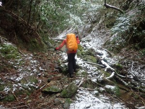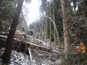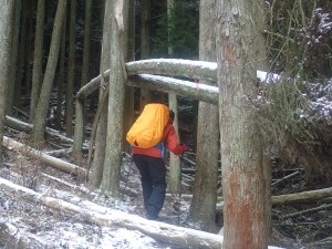 | 谷を詰める | 雪の重みで倒れた木々 | 倒木のトンネルを通過 |