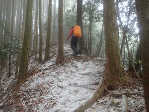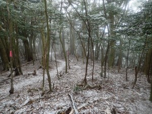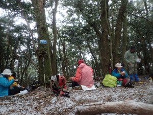 | 鉄塔がある開けた場所もガスで展望なし | 鹿見岐れでランチタイム(11:38-12:00) | 薄っすらと雪化粧した登山道はきれいだ |