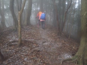 | ガスが濃くなってきた | 山頂直下の急登 | 犬鳴山頂上(14:00) |