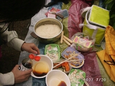 今日の昼食 ・茹でたてのソーメン ・自家製漬物 ・コンビニのマカロニ、ポテトサラダ ・オイルサーデン(コンロで暖めて食べる) 今日は「何と!!」なべさんが山頂でソーメンを企画してくれました。 山頂は風が強いので山道脇でシートを広げ、立ったままの食事でした。 ソーメンは茹でて水で冷やし、できたのおいしさを味わいます。 夏ならでは企画でした。 なべさん:「シーチキンを入れるとおいしいよ」 |