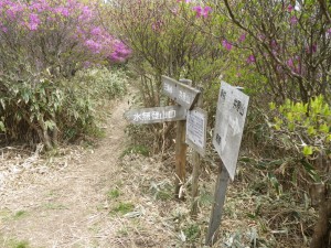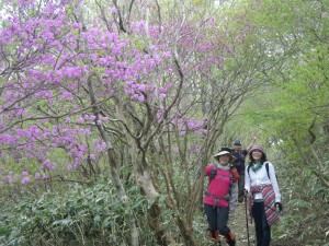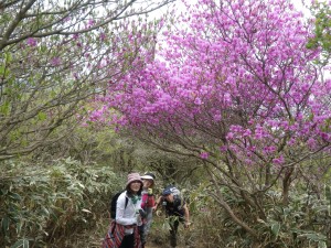 2013年5月3日(日) 天気 晴れ ■出発時間:午前7時30分(自宅) ■集合時間&場所:午前9時、JA伊都采彩 ■メンバー:I氏ご夫妻、SUMさん、家内と私の5名 仕事仲間のTさんから「山に誘ってぇ」と社交辞令なのかどうかわからないが、本気にした私は早速計画をした。 Iさんと同じ会社のSUMさんも誘い、二人の在住している場所に近くてこの時期はミツバツツジの花が見ごろなので井原山に決定した。 GWの初日でもあるが、高速が事故のため大混雑となり八幡I.Cで降りて若宮から再び九州道に戻り、古賀I.Cで降りて香椎から都市高速に乗り、何とか5分程度の遅刻で集合場所に着いた。そこから登山口へ移動したが、今度は車が満車状態で何とか邪魔にならないように路肩に停めようやくの思いで出発した。 今回はアンの滝経由で山頂に行くが、登山が初めての方もいるので周回コースではなくピストンもありと考えていたが、山頂での様子では大丈夫そうなので水無登山口方向へ降る周回コースを歩いた。 今回の目玉であるミツバツツジの花は、予想通り見ごろで山頂付近では皆喜んでくれて正直ほっとした。 下山の水無林間歩道は、登り返しもあって、全員疲れたようで休憩を度々とったためかなり長く感じた。 今思えば、初めての方にとっては、かなりハードなコースだったのでないだろうか 最後までがんばって歩いてくれて本当に感謝である。 これに懲りず、登山を楽しんでいただきたいと願う。 ■行程 キトク橋登山口(9:50)-アンの滝(10:32)-水無分岐(11:27)-頂上(12:15)-昼食後出発(12:52)-水無登山口への分岐(12:59)-林間歩道入口(14:00)-アンの滝コースとの合流地点(14:40)-キトク橋登山口(15:27) ※全行程で約5時間40分でした。 |
