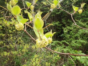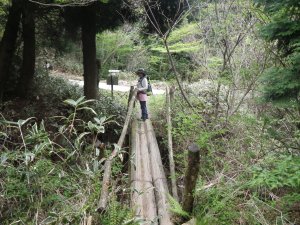 | ようやく自然林に出たが | 木の橋を渡ると林道に出た | これはクロモジかな? |