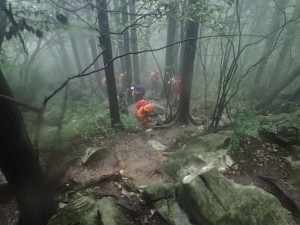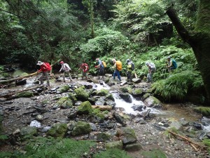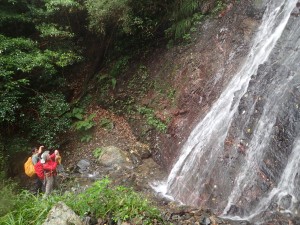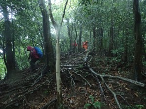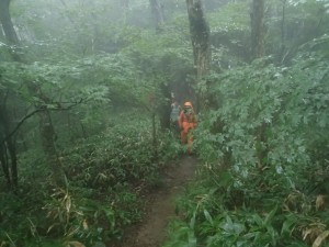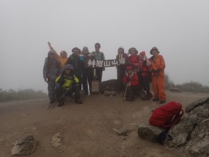平成28年8月28日(日)天気 雨 ■出発時間:午前6時35分JR下曽根駅、6時50分小倉南区役所横公園 ■メンバー:男性7人、女性6人 雨天決行が基本の「アタック山の会」。しかし、安全第一も基本である。 当初計画していた荒井谷コースは、降雨で増水すると立往生してしまう可能性があるため急遽、ダルメキ谷(アンの滝経由)コースに変更した。それでも雨量によっては渡渉が困難になることもあるが、登山口に着いても雨が降る様子がない。このまま昼までもてば下山できると考えたが、念のため10mのロープを持参した。ヘルメットやシュリンゲ、スワミベルトを装備するメンバーもいてくれた。 天気予報のおかげでいつも混雑するキトク橋の駐車場は、我々の車だけである。 歩き始めてしばらくすると霧雨から小雨になってきた。予定より、歩くのが遅い。これでは昼(13時頃)に下山することはできないかもしれない。と思いながら山頂にようやく着く。一人体調が悪いと付き添いと一緒に遅れて来ているので集合写真は全員ではない。 山頂は、雨よりも風が強く、すぐに下山開始、往路を戻る。 雨が当たらない場所で行動食をとって歩き始めると雷が鳴りだした。身体に当たる雨粒は大きくなったような気がする。 アンの滝の前の渡渉箇所では既に増水している。ロープを取り出し、これから続く渡渉に備える。幸い今日は頼りになる男性群が多い。ロープを張ってクリアしてゆく。ある人は滑って肩から浸かった人もいるが、面白がってのことかもしれない。皆、無事に渡渉し終わったときは、スリリングな登山を楽しんだのと同時に自然の怖さを感じたのではないだろうか。 今日も自然に山に感謝!! ■コースタイム キトク橋P-(35分)-林道-(23分)-アンの滝-(5分)-水無林間歩道分岐-(90分)-従走路-(6分)-井原山頂上-(60分)-ベンチのある場所-(30分)-アンの滝-(55分)-林道-(45分)-キトク橋P ※休憩時間含まず。全行程で約6時間でした。※歩行距離10.6km、高低差743m |