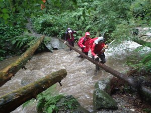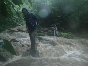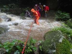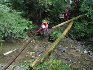 | ロープを張る | カラビナを付けて | 往路の写真と比較すると水量がわかる |