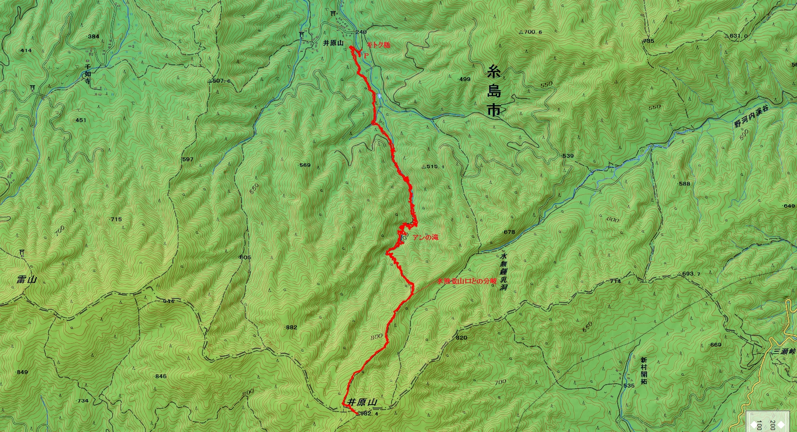井原山ダルメキ谷登山コース(GPSによる歩行軌跡)
