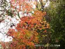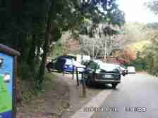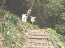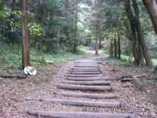 | 水を汲みに来ている | 今回のコース 登山口からは、木の階段が続きます。結構これがきついんですね。最初はゆっくり行きましょう。20分ほどで左手「一般道」右手「自然歩道」と分岐に到着します。今回は帰路に「一般道」を使うので「自然歩道」を行きます。すぐに「ムクロジの木」があるという看板があります。ムクロジの実は羽子板の羽につかわれるそうです。結局どれが「ムクロジ」なのかわからず、紅葉だけを楽しみ、緩やかなアップダウンを繰り返し、途中小さな沢を横切り、やがて尾根で上畑からの分岐に着きました。振り返ると大きな「きのこ」があるではありませんか、「サルノコシカケ」の一種でしょう。登山口から約40分で到着です。 尾根は海からの風が強く、今までの静けさがうそのようでした。 分岐からは、急坂になっていてロープもあるのでおそらく雨の日は滑りやすくなるでしょう。急坂を5〜6分で、「残り300m」の標識があります。 もうすぐです。 |