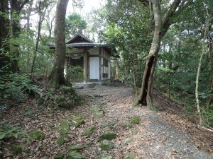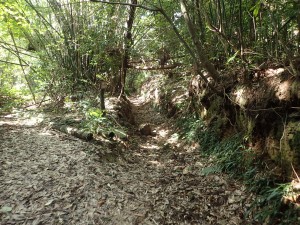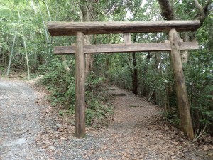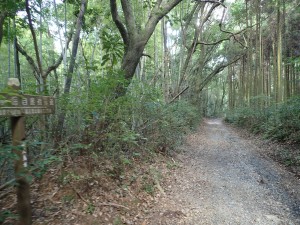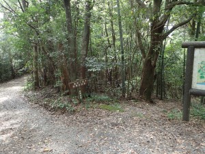 | 裏参道か?古い木の鳥居 | 鳥居の傍に自然遊歩道の入口(11:47) | 竹林の混ざる樹林帯 |