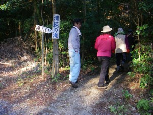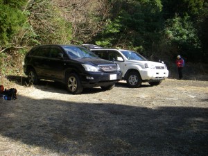 | 林道終点に駐車スペース(登山口) | 出発前に(MORIさん撮影)・・・・・右から2番目がカラス | 沢沿いにしばらく歩く |