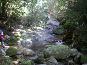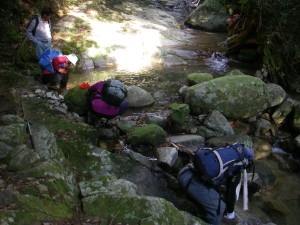 | 沢を横断 | 岩壁の横を歩く | 土を洗うメンバー |