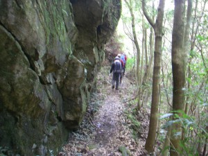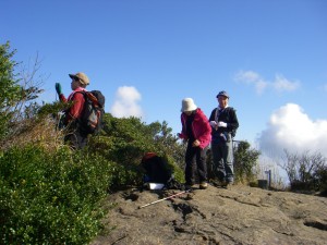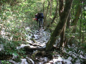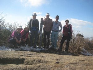 2011年1月8日(土) 天気 曇り時々晴れ 遊山歩1月度例会登山は、連休を利用して鹿児島県の大隅半島の山を3座歩くこととなった。今回の3座は九州百名山に入っているらしく、いずれも一度は歩きたいと思っていた山なのでとても楽しみだ。参加者はMORIさん夫妻、豊津の信ちゃん夫妻、あこちゃんと私の6名である。残念ながら家内は両親の介護と愛犬の世話で留守番となった。今回も計画はMORIさんが、タイムスケジュール、宿の手配まで何から何までしていただき、いつものことだが感謝の限りである。 午前7時30分に鞍手PAで待ち合わせて出発である。 <アクセス> 九州道はえびのJCから宮崎道へと進み、都城I.Cで降りる。国道10号線を下り大岩田交差点左折して国道269号線へと進む。有明町芝用を左折し、約3Km先の信号を右折して国道220号線に出たら(左折するとすぐに道駅「くにの松原おおさき」がある。)右折する。国道220号線を西へと進み宮下の信号を左折して県道73号線に出る。中央病院の交差点を真っ直ぐ南にひたすら進むと二股川キャンプ場に着く。そのすぐ先の左手に甫与志林道への入口があるので入る。道は砂利道で幅も狭いので離合場所に注意しながら進む。約2.5Km地点で清純の滝への入口があり、それから約1Kmで林道の終点となる。 <コース詳細> 林道終点の登山口から杉林の中、沢沿いにしばらく歩きます。沢を横断して山腹を歩き、一旦沢に出ると自然林となり、急登となります。途中、展望所と表示がありますが、下山時に立ち寄ることにしてそのまま高度を上げます。青空が見えてくると目の前に大きな岩が現れます。山頂の真下の岩屋です。左に回り込むと山頂に出ます。山頂は360度の展望です。遠くに開聞岳を見ることもできます。帰路は往路を引き返します。 <おまけ> 林道の途中に清純の滝があります。林道から200mほどのところなので立ち寄ります。落差は大した事はありませんが、なかなかきれいな滝でした。 <今夜の宿> 湯の谷温泉(肝付町岸良交流センター)鹿児島県肝属郡肝付町岸良1603-20 TEL0994-34-6161 とにかくお湯良し、料理良しでした。(価格も)何よりも管理人の方に良くしていただきました。ありがとうございました。 <明日も続く> 明日はここからさらに南に位置する稲尾岳です。翌日へ |