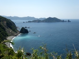 | リアス式海岸(絶景です) | 眺めを楽しみながら昼食 | 道路挟んで反対側に登山口 |