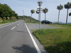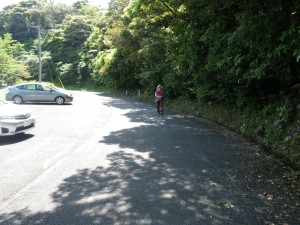 | 車道に出た(右に進む) | 車道から見た頂上付近 | 神社の駐車場を通過 |