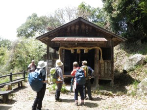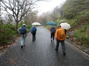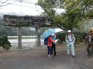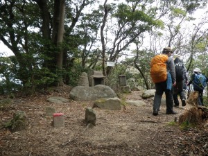 2012年4月14日(日)雨のち晴れ ■出発時間:午前7時20分(自宅) ■メンバー:MORIさん夫妻、がしんさん、あこちゃん、宮ちゃん、そして私たち夫婦の7名 遊山歩4月例会は、佐賀県は佐賀市の金敷城山(かなしきじょうやま)である。がしんさんに我が家まで来ていただき、鞍手PAで中間の宮ちゃんと乗り合わせて集合場所の金立SAに向かう。金立SAには無事予定通り8時50分に到着。MORIさんと合流し、巨石パーク入口へ。駐車場が封鎖されていたので入口の駐車スペースに停めさせてもらう。9時25分、登山開始。車道を傘をさしてのんびりとしばらく歩くき管理棟を右に見る。ここまで車が入ってこれるようだ。車道が終わると広場の左手に巨石群登山道入口とある。階段状の登山道を歩くといよいよ巨石群が現れる。まずは神頭石、神の頭に似ているとのことだが、神を見たことがないので私にはわからない。次は道祖神岩。そして兜岩、御船岩、龍の石、造化大明神、イナリ石、誕生石、屏風岩、烏帽子岩、御座石、天神石と続き烏帽子岩から戻って天の岩門へと廻る。雄神石、神籠石を過ぎると天の岩門である。少し進むと蛙石がある、私には蛙にはどうしても見えないが、一番印象的な巨石だった。反射板を過ぎると左手が開け景色を楽しめる。すぐに山頂への分岐がある。乙文殊宮方面とへと進む。爽やかな道であるがすぐに工事中の林道に出た。何のための工事何だろうといつものことだが疑問に感じながら再び登山道に入り込むとすぐに山頂に着いた。(11時半)ここでランチタイムとする。今日は久しぶりにカミさんが、おにぎり&おかずを作ってきた。やっぱり手作りが良い。何しろ安く済む。ランチを楽しんで下山である。周回コースなので乙文殊宮へと向かう。植林帯と自然林の間を歩きしばらく行くと巨石が現れる。乙文殊宮とたもと石である。文殊菩薩は、知恵を象徴する仏であることから試験合格祈願の参拝者が多いと説明がある。それにしても祈願のため手を合わせるのは良いが・・・ここは通称「落書き堂」と呼ばれているそうだ。落ちると言う字があるが・・・・。13時5分、参道を降ると文殊院に出る。手を合わせて車道に出ると「佐賀の奥座敷、九州の嵐山へようこそ」とある。シャクナゲの花が見事に咲いていたのでしばらく鑑賞することにした。朝の雨が嘘のように空は青く、陽が眩しく、そして同時に暑さも感じる。ここからは、20分ほど車道を歩きスタート地点の巨石パーク入口に無事着いた。今日も自然に山に仲間に感謝である。 <コースタイム> 巨石パーク入口-(20分)-巨石群登山道入口-(70分)-巨石巡りから天の岩門-(25分)-山頂-(35分)-乙文殊宮-(15分)-文殊院-(20分)-巨石パーク入口※休憩時間は含まず。全行程で約4.5時間でした。 |