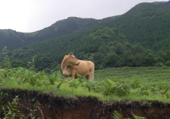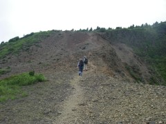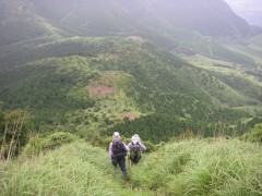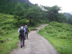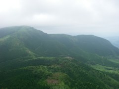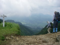 | 前ページから 山頂は360度の展望です。ここで先客のご夫婦に写真を撮ってもらいました。昼食を済ませ、縦走路目指し、出発です。登ってきた道と反対側(北東)から降ります。草原の登山道から林の中へと入って行きT字路の分岐に出ると左、護王峠へと進みます。アップダウンを繰り返し、土のむき出しの登山道が阿蘇らしさを感じ、花々を見て進むと一ノ峰との分岐に出ます。ここは迷わずそのまま真っ直ぐ進み、林を抜けると俵山が見えてきます。滑りやすい急斜面を下り、平坦な道をしばらく行くと鞍部に出ます。護王峠です。ここで俵山峠から来たチームと合流し、私はここから久木野村へと下山することにしました。しばらく自然林の中を歩くと急に開けた場所に飛び出ます。柵があるので牧場だとわかります。ここからは牧場の中を歩きます。すぐに舗装道となってしばらく歩くとゲートがあります。ひたすら舗装道を歩き、牧場の出入口ゲートに着きます。民家の中を抜けて大きな車道に出ると久木野村堀渡です。ここでもうひとつのチームを待ちます。 <参考コースタイム> 地蔵峠登山口−(6分)−地蔵峠−(20分)-森の広場分岐-(10分)−十文字峠分岐-(15分)-グリーンロード−(60分)-鉄塔下−(15分)-冠ケ岳山頂−(15分)−縦走路-(30分)-一ノ峰分岐-(50分)-護王峠-(20分)-柵-(25分)-ゲート-(30分)-ゲート-(20分)-堀渡(車道) ※休憩時間は含んでいません。あくまでも参考時間です。全行程で約5.5時間でした。 <感想> 車のキーを失くすと言うアクシデントもありましたが、地元の人の心温かいご厚意で助かりました。本当にありがとうございました。今回はとにかく暑さに負けてしまい、昔からの膝をも痛めてしまいました。日頃の体調管理とトレーニングが大切だとつくづく感じました。最後に下山口付近の久木野温泉に寄りました。入浴料300円はリーズナブルです。 |