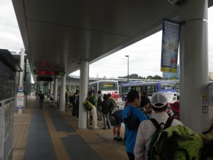 | 電車の窓から筑波山が見える | バス亭は多くの人が並んでいた(7:50) | 筑波神社入口(8:45) |
