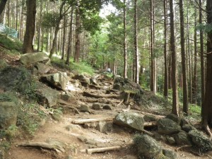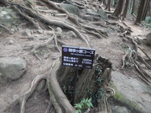 | 本格的な登山道が始まる | 男体山頂まで2100mとある(9:06) | 階段状の登山 |