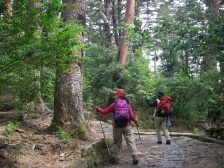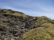 | 前ページから 大浪池休憩所から約50分で避難小屋がある西回り東回りの合流点でもある韓国岳への取り付き点に出ます。小休憩してここより木の階段が続きます。高度をぐんぐん上げ、勾配は益々急となり木の階段からガレバとなって景色を眺めながら喘いでいると山頂が見えてきます。合流点から約1時間です。反対から歩いてきたメンバーが昼食をちょうど終えた時でした。時計を見るとちょうど正午だったので私もここで昼食を済ませることにしました。下山は全員一緒に往路を降ります。 <参考コースタイム> 大浪池登山口駐車場−(30分)−大浪池休憩所−(40分)−避難小屋−(60分)−韓国岳山頂−(40分)−避難小屋−(50分)−大浪池休憩所−(30分)−大浪池登山口駐車場 ※休憩時間は含んでいません。あくまでも参考時間です。全行程で約5時間でした。 <まとめ> 霧島はこれで3度目ですが、その雄大さは何度きても感動してしまいます。今回、初めて大浪池から韓国岳を歩きましたが、まじかに見た火口湖の大きさには驚きました。避難小屋から木道が整備され歩き安いのですが、雨天の場合に降るのは滑りやすく注意が必要のようです。 大浪池の淵でマンサクが開花していました。季節外れのような気がします。 次回、本番はミヤマキリシマの時期で楽しみです。 |