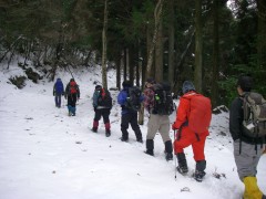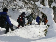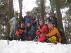 2009年1月17日 天気 曇り 遊山歩1月の新年例会登山は、MORIさんの企画で苅又山である。苅又山は英彦山の東側に位置するとんがった山で通常は薬師林道から入るが、さすがMORIさんの企画とあって北岳肩から裏彦山ルートへ出て尾根道を歩き苅又山へと歩くというロングコースである。参加者はMORIさん夫妻にシュー左衛門さん、フクロウさん、あずきさん、KENさん、そして初顔合わせの新会員の豊津の信ちゃん俊ちゃん夫妻と私たち夫婦の10名である。集合は8時30分JR彦山駅、スタッドレスタイヤを装備した車に便乗させていただき高住神社へと。雪はかなり深そうだ。 <今回のコース> 高住神社から北岳の肩を目指し、東南の谷間を降り、裏彦山のルートに出ると左手に進みさらに尾根に出ると最先端まで進み、右に巻いて尾根沿いにひたすら歩くとピークが何度かあり、北側が開けて急登すると苅又山山頂に出る。帰路は912mのピークまで戻り北へと急降下すると沢に出て上り返すと薬師林道に出る。薬師林道を道なりに戻る(西北に歩く)と天狗ラインに出る。 <参考コースタイム> 高住神社−(70分)−北岳肩−(30分)−裏彦山ルート−(2時間15分)−苅又山山頂-(40分)-912mピークの分岐点-(30分)-薬師林道-(1時間15分)-高住神社 ※休憩時間は含まれていません。全行程で約7時間でした。 雪が深かったので時間は思った以上にかかったが、とにかく雪の山は面白い。 そして今回のルートもなかなかで近場にこんなところがあるとは恵まれているとつくづく感じた。 |