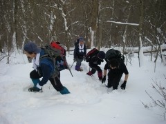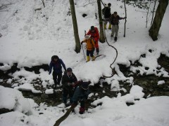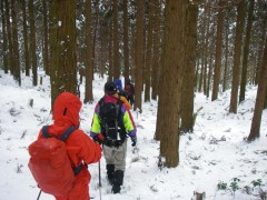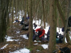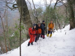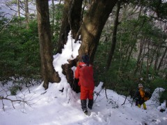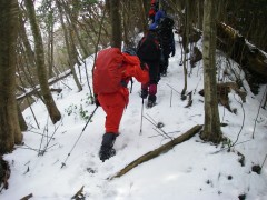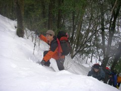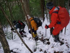 | 急斜面で滑る | 沢に出て上り返すと林道 | もう少しで林道だ |