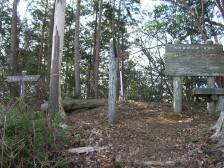 本日のコース 「九州自然歩道」と書かれた標識より、(仮に今回はここを「登山口」とします)茶畑や栗の林がある舗装された緩やかな坂道を歩きます。15分程度でまた「九州自然歩道」、「スズメバチ・マムシ注意!」と書かれた立札(写真右下)があるのでここよりひとのぼりすると稜線で、左に大平山、右に雁股山と書かれた立札がありベンチもあります。(写真左下)ここより雁股山を目指し、緩やかなアップダウンを繰り返し、急降下すると「刈股林道0.3km」「経読7.3km」の標識があります。少し行くと(登山口から約30分)で急登となり「経読7.0km」「刈股0.6km」の立札とベンチがあります。案内板には近くの山「松尾山」の説明版があります。一息ついてさらに高度を上げると0.4kmの表示があり、なだらかな道を10分程度で山頂です。「二等三角点」見て、今度は西峰を目指します。一旦下り、鎖場を上り返すとベンチのある明るい広場に出ます。山頂は5m程先です。今回はここで食事をとりました。 |