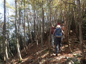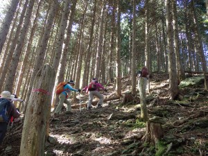| 鷹巣山上部が見える | 登山口 | 植林帯の急斜面を歩く |