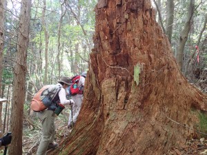 | 落石に注意 | 大きな株 | 尾根歩きが始まる |