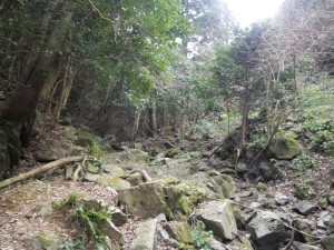 | 真中のピークが頂上か | 巨木だ | 石がごろごろとある |