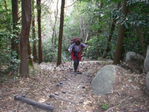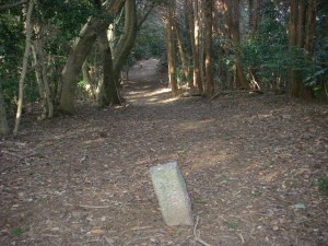 | アンテナの上部に展望台があった | 再び階段状の急斜面を歩く | 道の真中に境界石 |