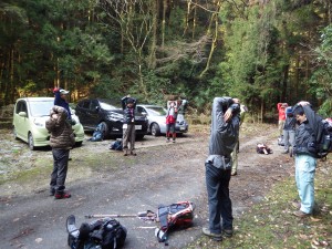 | 渡渉中 | 林道歩き | スタート地点はすぐ(13:40) |