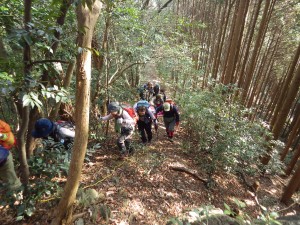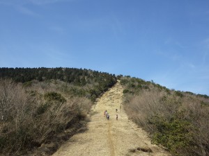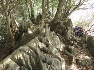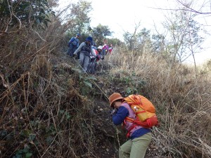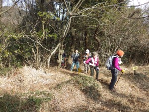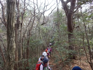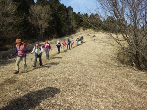 平成27年1月25日(日) 天気 晴れ ■出発時間:午前7時30分(小倉南区葛原) 8時10分(JR採銅所駅) ■メンバー:男性6名 女性8名 計14名 「金満尾根」これを「きんまんおね」と呼ぶか「かねみつおね」と呼ぶか・・・・。山の会のメンバーは金が満杯で縁起が良いので「きんまんおね」と呼ぼうと意見が一致する。 この尾根は金辺峠(きべとうげ)から満干越(みちひこし)を経て金満山(かねみつやま)に続くが国土地理院の地形図には「金辺峠」以外の名は出てこない。 登山道を開いた方達が名を付けた場所もあるようだ。 それはともかく、以前(2007年1月)に比べ本当に道標もしっかりして整備されたので迷うこともないであろう。 アタック山の会の今年の新年会は、私の九州百名山完登祝いを兼ねて別の日にしてくれた。 今日は新年登山であるが、下山後の一杯は帰宅後となる。近場なので本当はパーッと行きたいところだが・・・・・。 さて日頃の行いが良く、天気はすこぶる良い。金満尾根は、まず松の木が多く、落ち葉がきれいだ。滝も見ごたえあるし、石灰岩の岩場は不思議な世界である。灌木帯、樹林帯を抜け広い防火帯に飛び出ると青空が広がって気持良い。 焼立山と思っていた場所に来るといつのまにか「赤牟田の辻」となっていて某山の会が「ここは焼立山ではありません」と詳細を記載したシートが掛かっていた。 じゃー焼立山はどこ?・・・・と正面を見るとピークが見えるが私の記憶では向こうが「赤牟田の辻」だったはず。ま、時間も早いので「あそこまで行こう!」と皆に声をかけた。 旧赤牟田の辻は、焼立山の木札が立っていた。そこからは福智山が見える。反対に下る坂は 、念仏坂である。 福智山を眺めながら昼食しているといい臭いが・・・・隣のパーティがホルモン鍋を始めた。 臭いだけいただき、下山開始。 帰路は縦走路を南に降り、途中から鮎返新道へと谷間を降る。往路は「尾根」、帰路は「谷」と言うことである。そのため全く違う景観を見ながら歩ける。と言っても植林帯が続くので少々飽きてしま人もいたようであるが。 ところで当会メンバー唯一30代のU氏が珍しいシダを2種類も見つけてこれは大発見だと聞かされた。言われなければ全く気がつかなかった。良く見ると本当に見たことがないシダであった。 無事に下山して採銅所駅で解散。今日も自然に、山に、地元の人に、仲間に感謝である。 ■コースタイム 駐車場-(30分)-尾根-(6分)-満干越-(15分)-滝-(40分)-金満山-(50分)-赤牟田の辻-(15分)-焼立山-(20分)-鮎返新道入口-(23分)-兵頭岩-(45分)-駐車場 ※休憩時間は含めず。全行程で5時間10分でした。 |