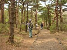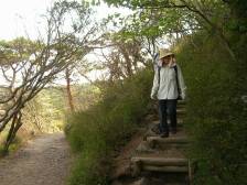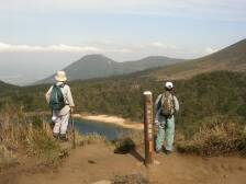 2006年5月5日 天気晴れ 高千穂峰を制覇した私たちは時間と体力に多少余裕があるため、予定通り(MORIさんの提案)白鳥山と甑岳を行くことにした。車は来たときに通り過ぎたエコミュージアムセンターまで戻り、有料駐車場(舗装されていない方)に駐車し、今夜はここで車中泊することにした。 <コース詳細> エコミュージアムセンターと隣接しているビジターセンターの横に「池めぐりコース」と書かれた標識がありますのでここが登山口となります。観光客が歩けように良く整備された路を歩きますが高度上げる内に自然道となります。松林になり、急に開けると展望所に着きます。ここからは六観音池、白紫池が見渡せ、もちろん甑岳(こしきだけ)も一望できます。 一息ついてミヤマキリシマの群生している平坦な道を進みます。やがて広いがれ場となりひと登りすると白鳥山山頂です。山頂からは韓国岳等、東側、南側の展望が可能です。 展望を味わったら池の縁を廻るように林の稜線を進みます。目の前が急に開けて六観音池が見えたところでベンチがありますので一息です。ここからは急降下します。階段を降りると整備された広い路に出ます。六観音池の北側を廻ります。ミツバツツジに見とれて巨大杉に驚き、六観音に到着です。ここの展望所からの韓国岳は写真にするにはとても良いアングルです。緩やかな道から少し上り、松林(赤松)が終わると左手に甑岳への標識があります。ここからはテープが頼りとなります。林の中を下って行くと露天風呂との分岐にでます。しばらく緩やかな路が続き、九重のソババッケのような窪みにでます。倒木でかなり荒れています。しばらくいくと急登となり、這い上がると山頂です。山頂は360度の展望で爽快です。また、北側には広い湿地帯があります。帰路は露天風呂の分岐まで戻り、露天風呂の方へ行きます。ほぼ平坦な道です。車道に出たら右、ビジターセンターへ向います。やがて不動池が現れ、車道から川沿いに遊歩道を歩き「川湯」と書かれた標識がある河原をすぎ、車道を横断すると出発点の駐車場に到着です。 次ページへ |
