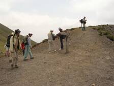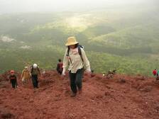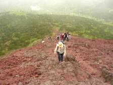 | 高千穂峰が見えてきた | 急斜面でしかも足元が悪い | 遠くの下に見えるのが駐車場 |