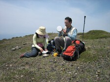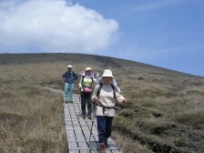 | 昼食中(MORIさん提供) | 中岳目指す | 木の桟道は歩きやすい |