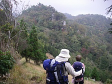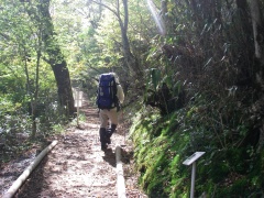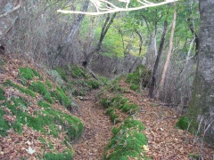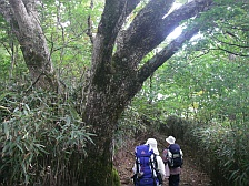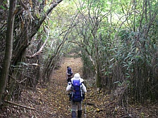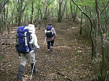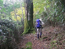 2008年10月12日(日)晴れ 今回もMORIさんのお誘いでの山行だ。前々から話に上がっていた霧立越に1泊登山に出掛けることになった。霧立越は「きったちこし」と呼ばれているらしいが「きりたちこし」でも間違いではないようで宮崎県の椎葉村から五ケ瀬町鞍岡への旧峠道とのこと。昔は馬に荷物を載せ運んだらしく途中に馬つなぎ場があったりする。稜線沿いを行く道だが、さすがに馬も通る道だけあって緩やかな道であるため歩きやすい。今回は五ケ瀬ハイランドスキー場の下の白岩登山口(通称ごぼう畠)から扇山を縦走し、扇山山小屋に1泊。翌日は再び往路をとりさらに向坂山と小川岳に登頂する予定である。午前7時、我が家を出発。途中、大平楽や城山展望所に立ち寄り、登山口に着いたのはちょうど正午だった。ここで昼食を取り出発だ。 <アクセス> 高速道を利用することも考えたが、もったいないので九重回りで行くことに。阿蘇は国道57号線に出たら265号線で高森方面へ根子岳を右手に見て高森を抜けそよかぜパークを右に見て五ケ渓谷を過ぎたら白岩交差点を右折(五ケ瀬ハイランドスキー場の標識有)し、道なりにゆくとスキー場の駐車場がある。道は狭くなるがそのまま進むと登山口に7~8台の駐車スペースがある。 <1日目> 登山口より階段状のなだらかな上りの遊歩道を歩きます。約20分で向坂山との分岐点の杉越(白岩峠)に着きます。「霧立越関所」と書かれた登山届の箱がありますので記帳します。白岩山まで1.3Kmの標識を見ていよいよ縦走路を歩きます。なだらかな道なので25分程度で白岩山山頂です。ここまでを目的としたファミリーや登山者もいました。縦走路に戻り、再び歩き始めます。15分程度歩くと水呑ノ頭(134m)と標識があります。分岐からすぐなので立ち寄ります。シャクナゲの群落があるようです。山頂で記念撮影をして縦走路を再び歩きます。扇山山小屋まで6.9Kmとあります。下り気味の縦走路は歩きやすく巨木や紅葉を楽しみながら歩くと右手に眺望の利く展望所があります。展望を楽しんで10分程度で平坦な広場に出ます。馬つなぎ場です。扇山山小屋まで3.9kmと標識にあります。休憩をして再び縦走路を歩きます。アップダウンを繰り返し、右手が開けて平家ブナと書かれた標識があります。目の前に大きな朽ちた木がありますが、きっとこれが平家ブナなんだろうと思い進みます。(次ページ) |