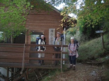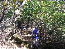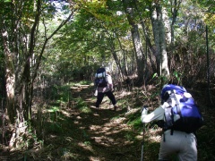 前ページからの続き 平家ブナを見て巨木に圧倒されながら進むと右手が急に開けます。大きな倒木をくぐり少し行くと山小屋が見えてきます。煙が出ていて先客がiいることがわかりました。山小屋の入口に扇山への標識があります。小屋に荷物を置いて山頂に行ってみます。20分程度で山頂です。残念ながらガスで何も見えませんでしたが、展望が望める山頂です。下山後は早速宴会の準備です。心配していた水場の水は水量は少ないもののしっかりと出ていました。 <2日目> 昨夜は先客のパーティの方々(天草の人)と盛り上がり、少々飲みすぎましたが、その分良く眠れたようです。朝起きると雲海の素晴らしさには驚きました。しかも朝焼けで赤みがかっていてなかなか見れない光景です。食事を済ませ扇山山小屋を出発です。来た道を戻りますが、それなりに景観が違っていて飽きることはありません。杉越まで無事に戻れた私たちは、これから向坂山から小川岳へと足を伸ばします。向坂山は階段状の山道をひたすら上ります。結構、きついと感じました。山頂はあまり展望は望めません。さらに山頂から東に進路を取りスキー場に出ます。スキー場に出たらゲレンデを下り、正面にクラブハウス?を見て左のゲレンデを下ります。下りきると小川岳登山口です。小さな標識があります。急登すると右が小川岳への縦走路で左に少し行くと山の肩で遠見ケ岩(黒岩)と名付けられた展望の良いピークへ出ます。もちろん立ち寄ります。展望を味わったら来た道を戻り、尾根道を歩きます。巨木や奇木に驚き、紅葉に心を和みながら、ほとんど下りのコースを歩きます。アップダウンが何度か過ぎ、偽ピークに一瞬喜びながらようやく小川岳に到着です。結構長い道のりでした。スキー場の登山口から約1.5時間かかりました。ここで昼食をとり下山です。帰路は上り中心のようで、かなりきついだろうなと思っていましたが、意外と楽だと感じました。スキー場に出たらゲレンデを一番最上部まで上り、クラブハウス?から車道を歩き、五ケ瀬川源流で喉を潤し、スタート地点に戻ります。<次ページ>コースタイム他 |