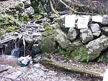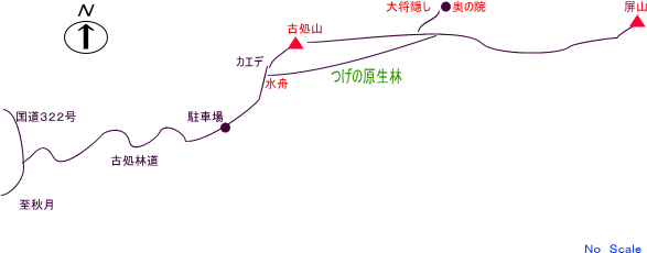 | 林道入り口の標識 | 今回のコース 古処林道は林道終点駐車場まで舗装されています。駐車場の奥が登山口となり沢沿いに進みます。すぐに「ジュースの無人販売」があり、20分程度で「牛岩」があり「7合目」とあります。石段が続きやがて平坦な道に出、登山口から50分程度で「水舟」に着きます。 ここで水を確保できますがほとんど枯れているようです。ベンチもあるので一息ついてさらに進むと大きなカエデが左手に2本あり、その先を右に鋭角に(戻りぎみ)少し行くと尾根にでます。大きな看板があるので現在地を確認し、左手の尾根沿いに屏山に向かって進みます。標識が見当たらないので不安になりますが「ツゲの林」が続くのでわかると思います。杉林を抜けると古処山からの道と屏山に向かう道との合流点に着きます。 ここまで約1時間20分(登山口から)です。次ページへ |