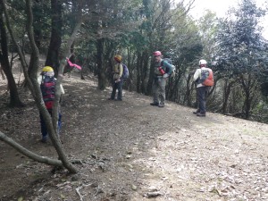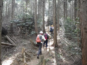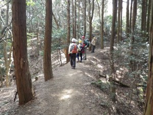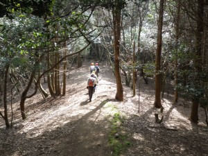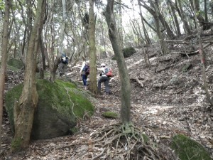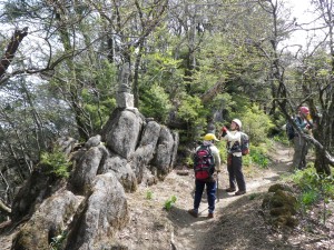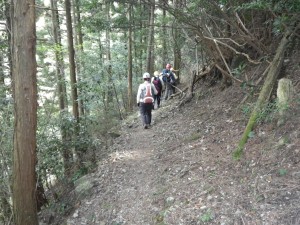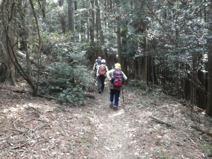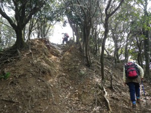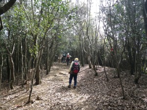 | 植林帯の尾根道を | 自然林の尾根道となる | ピークを巻いて |