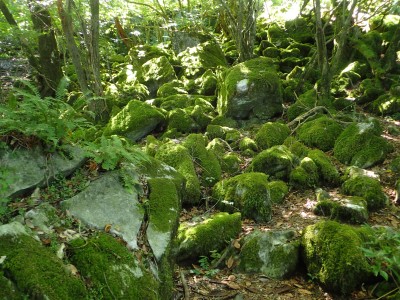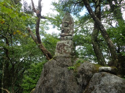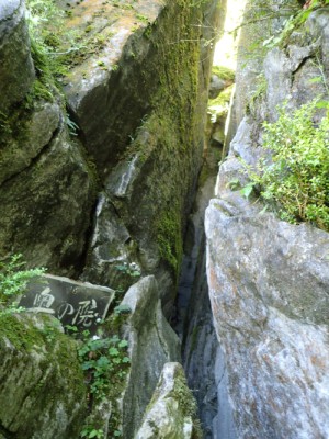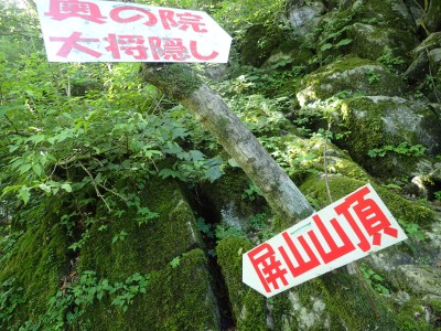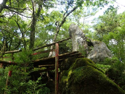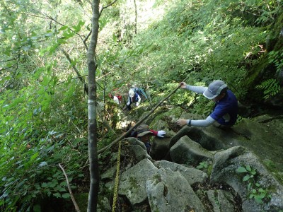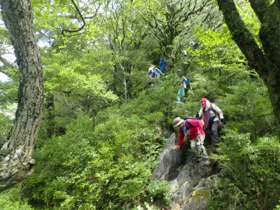 ここから入山する場合は、キャンプ場の管理等で登山届を出すのが決まり。久留米から現地集合で来てくれたHさんに代筆をお願いする。体操を済ませ出発。森林の中は、本当に涼しい。途中から奥の院への直登コースを辿る。初めてのルートでワクワクする。痩せた尾根は勾配がきつい。何度も呼吸を整えて登る。苔むした岩が現れると今までと全く違って「もののけの森」のようである。 そしてすぐに岩壁にぶつかる。 ここからは鎖場が連続する。最初の難所をクリアすると岩の割れ目から冷風が顔を覆う。ここが奥の院だ。しばらく冷風に当たっていたいとこだが、後続がすんなり登ってくる。