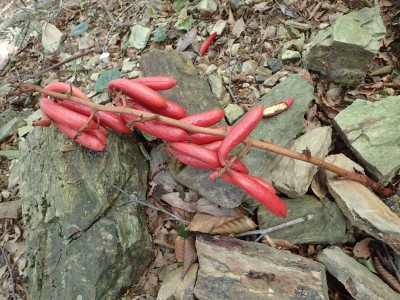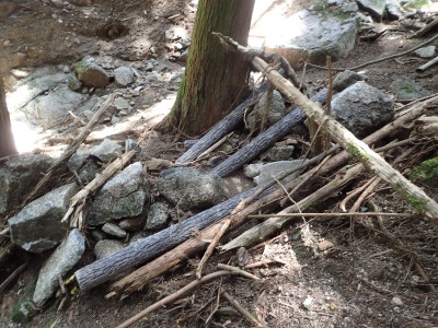 ゆっくりと昼食をして下山開始。今度は前回歩いた道だが、階段が流されていた。この前の豪雨だろうか。階段が流されるとこれが障害物に変わるのだ。