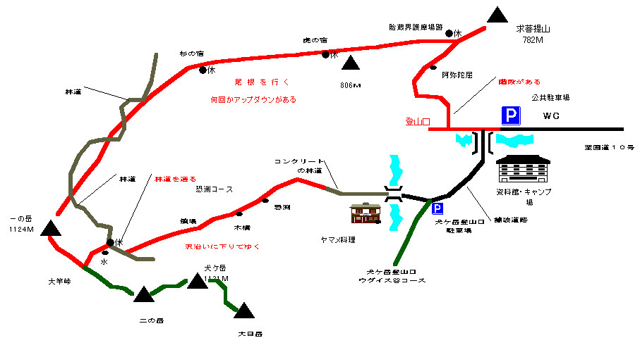 求菩提公共駐車場---5分---登山口----40分----阿弥陀屈----25分----胎蔵界護摩場跡--