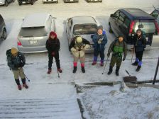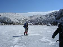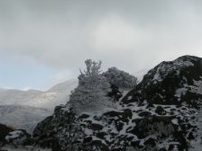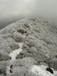 2007年1月28日 曇り時々晴れ 午前6時10分 Hさんの会社である集合場所から出発、今日は自然観察とボランティアの山の会の2月例会登山の下見である。男7人で車はスタッドレスを履いたYさんとKさんの車に便乗することとなった。 午前8時45分牧ノ戸峠駐車場の着く。さっそく準備にかかる。最近買ったアイゼンは本当に簡単に装着できる優れものだ。登山口で登山届けを書いて出発である。雪は少ないが霧氷が見事で天気もまずまずである。展望所よりコンクリート(雪で隠れているが)の坂を行き、階段を上がると久住山を望める沓掛山手前の展望所に着く。温度計はマイナス6度。ここで一息だ。雪山の景色は見たものしかわからない。そして雪の上を歩き童心に返る。九重は花、紅葉、雪と年中楽しめる。牧ノ戸登山口から約20分で沓掛山山頂となり一旦下り、霧氷に感動して稜線を歩き、西千里浜を左に見て久住山を目の前にして岩場を通り抜け下ると久住分れである。登山口から約1時間50分で来た。最近できたバイオレット(トイレ)があるのだが残念ながら大便用は詰っているのか、使用できる状態ではない。ここから久住山を目指す。雪が少ないため歩きづらい。急登を喘ぎ御池との分岐点を過ぎ、さらに急登を喘ぎ、久住分れから約30分で久住山山頂に着く。風が強いため記念写真を撮ってすぐに退散。来た道を戻り、御池を目指す。今回のテーマである池の氷結だ。久住山から約40分で御池に着く。凍っていた。スケートを気持ちよくしている人がいた。ここで昼食。風があると寒い。手袋を脱ぐとたまらなく冷たい。落ち着かず、帰路に着く。久住分れまでは北側の道を歩き、往路を帰る。牧ノ戸には御池から約2時間で着いた。 |